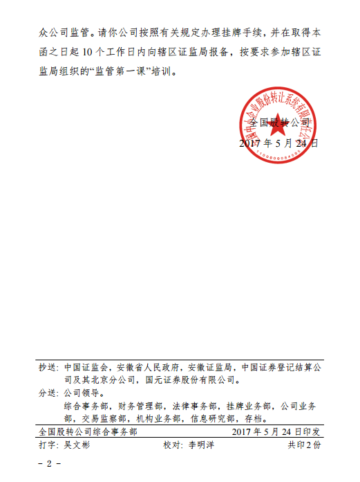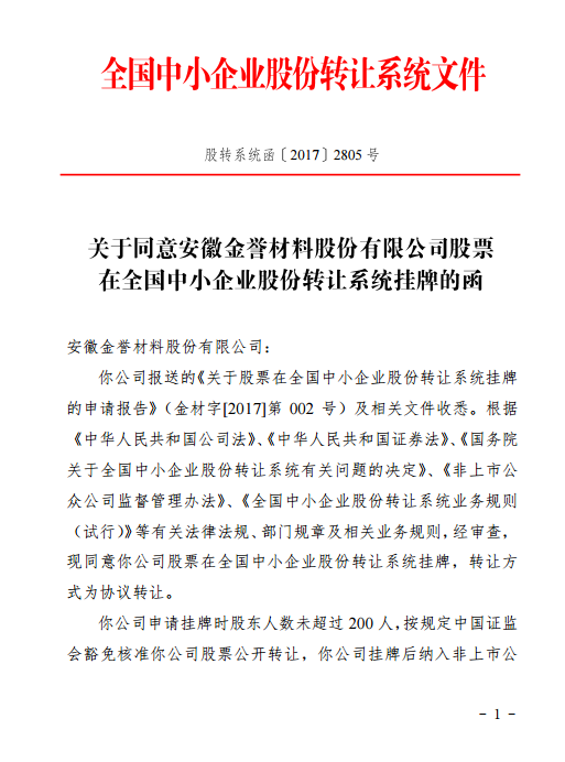 金譽(yù)股份:全國(guó)股份轉(zhuǎn)讓系統(tǒng)公司同意掛牌的函